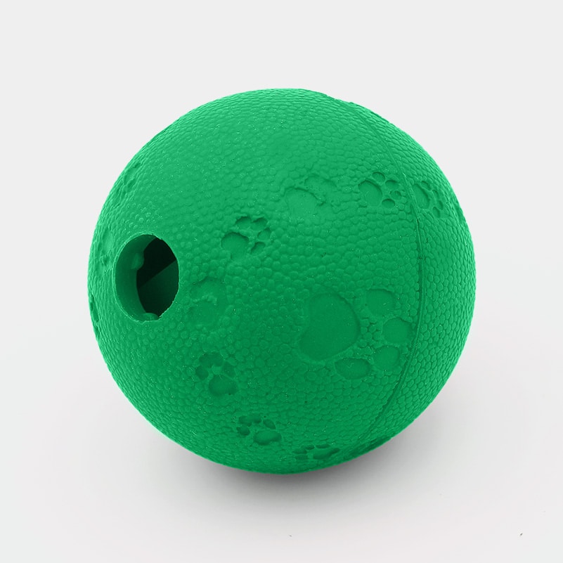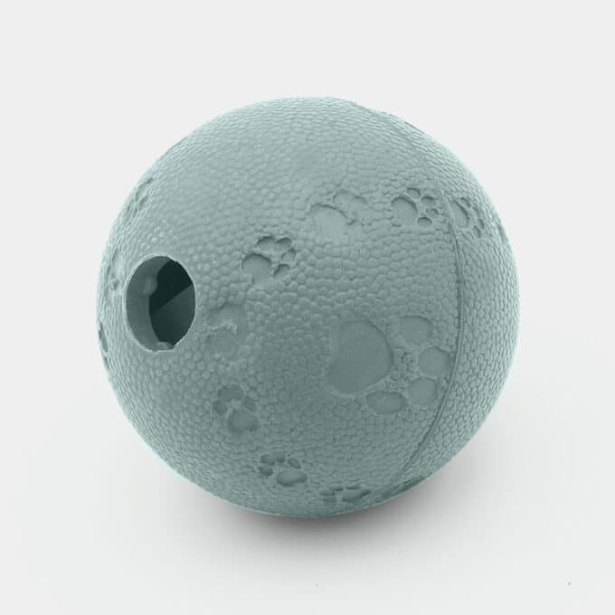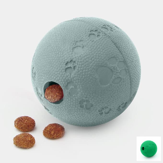 Cette balle creuse en caoutchouc naturel, de 6 cm de diamètre, comporte des obstacles à l’intérieur qui ralentissent la distribution des friandises ou des croquettes lorsque le chat la bouscule avec sa patte.