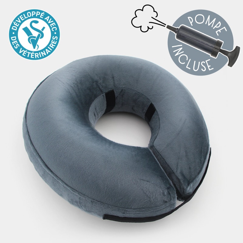 La collerette gonflable est une alternative moderne et confortable à la collerette traditionnelle en plastique rigide, appelée collier Elisabéthain. Constituée d’une bouée en PVC recouverte d’une housse en tissu très doux, cette collerette gonflable est légère et n’irrite pas le cou du chien.